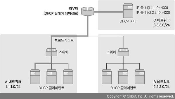 DHCP 서버에서 IP 주소를 할당받기 위해 DHCP 클라이언트와 DHCP 서버 간에 전송되는 패킷은 모두 브로드캐스트입니다. 브로드캐스트는 동일 네트워크에서만 전송되므로 DHCP를 사용하려면 각 네트워크마다 DHCP 서버가 있어야 합니다.