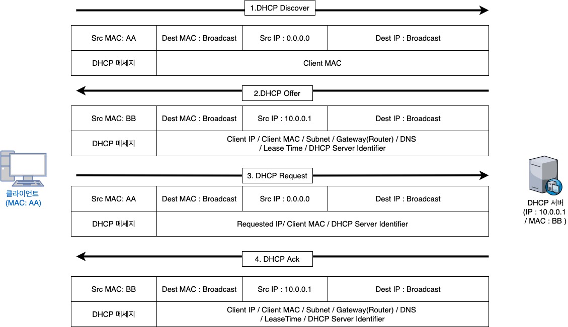 호스트가 DHCP 서버로 IP를 할당받는 과정은 다음 그림과 같이 4단계로 진행됩니다.